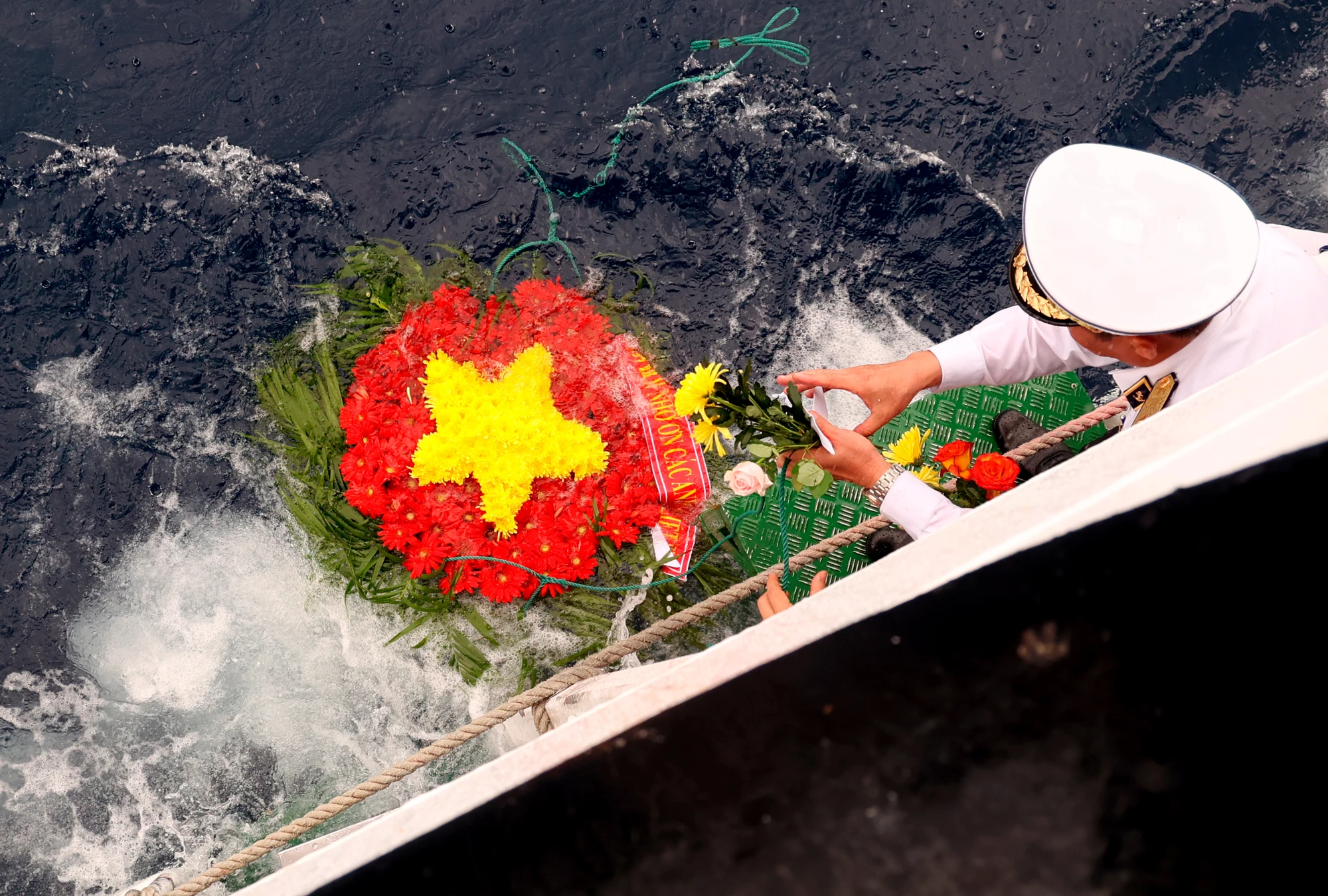 Nghi lễ thả vòng hoa, lễ vật xuống biển. Ảnh: An Hiếu Những cành hoa kết thành hình cờ Tổ Quốc mang theo tấm lòng tri ân sâu sắc, thành kính gửi đến anh linh các anh hùng liệt sĩ đã hy sinh tại Quần đảo Trường Sa. Ảnh: An Hiếu