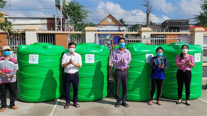 Trao bồn chứa nước cho hộ nghèo ở Bến Tre . Ảnh: Huỳnh Phúc Hậu - TTXVN