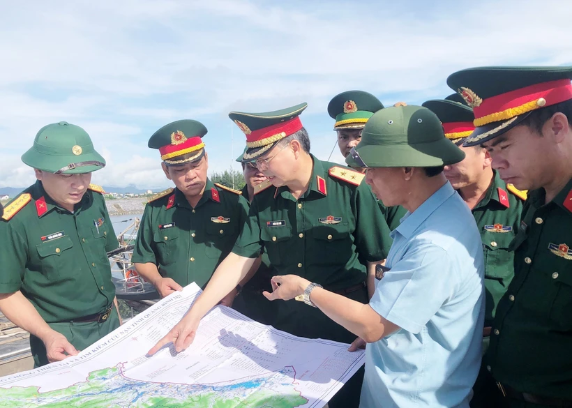 Đoàn công tác kiểm tra thực địa tình hình hoạt động của Khu neo đậu tránh trú bão cho tàu cá Cừa Phú, xã Bảo Ninh, thành phố Đồng Hới (Quảng Bình). Ảnh: TTXVN phát
