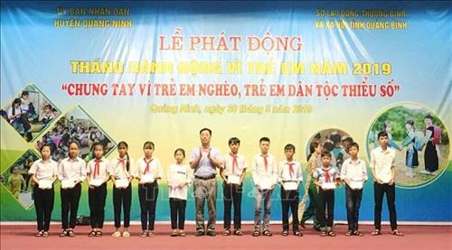 | Tặng quà cho trẻ em có hoàn cảnh đặc biệt khó khăn, trẻ em dân tộc và trẻ khuyết tật trên địa bàn huyện Quảng Ninh. Ảnh: Võ Dung-TTXVN |