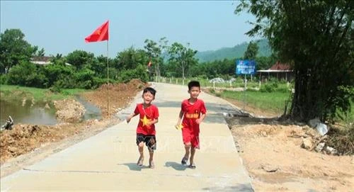 | Các em nhỏ trên cầu và đường vượt lũ mới. Ảnh: Võ Dung-TTXVN |