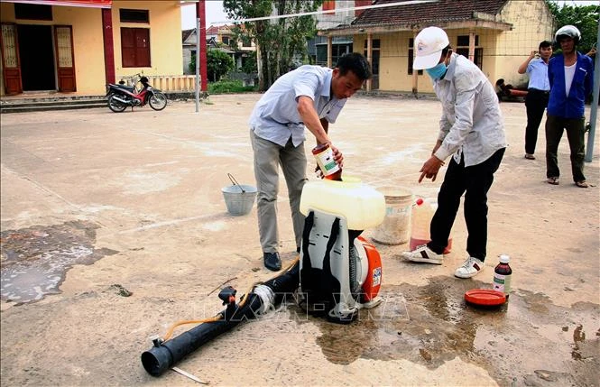Cán bộ Trung tâm y tế huyện Quảng Ninh (Quảng Bình) pha thuốc phun hóa chất diệt muỗi tại xã Võ Ninh. Ảnh: Văn Tý-TTXVN