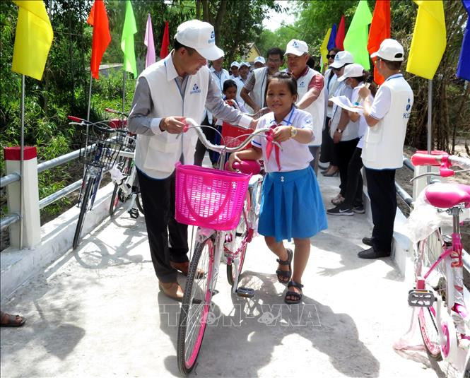 Trao tặng xe đạp cho các em học sinh nghèo vượt khó vươn lên trong học tập. Ảnh: Phước Ngọc- TTXVN