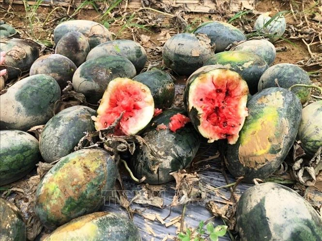 Dưa hấu của người dân trồng gần đến ngày thu hoạch bị hư hỏng do mưa lớn. Ảnh: TTXVN phát