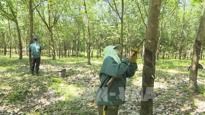 Công nhân Công ty Cao su Quảng Trị thu hoạch mủ cao su. Ảnh: Hồ Cầu - TTXVN