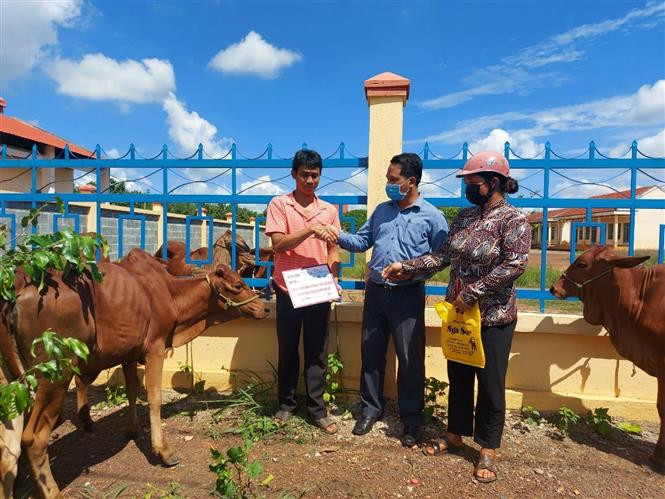 Trao giống vật nuôi cho hộ dân tộc thiểu số nghèo vùng biên phát triển kinh tế ở Bình Phước. Ảnh: K GỬIH - TTXVN