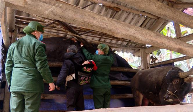Bộ đội Đồn biên phòng Y Tý, huyện Bát Xát (Lào Cai) giúp dân che chắn chuồng tránh rét cho đàn trâu. Ảnh: Quốc Khánh - TTXVN