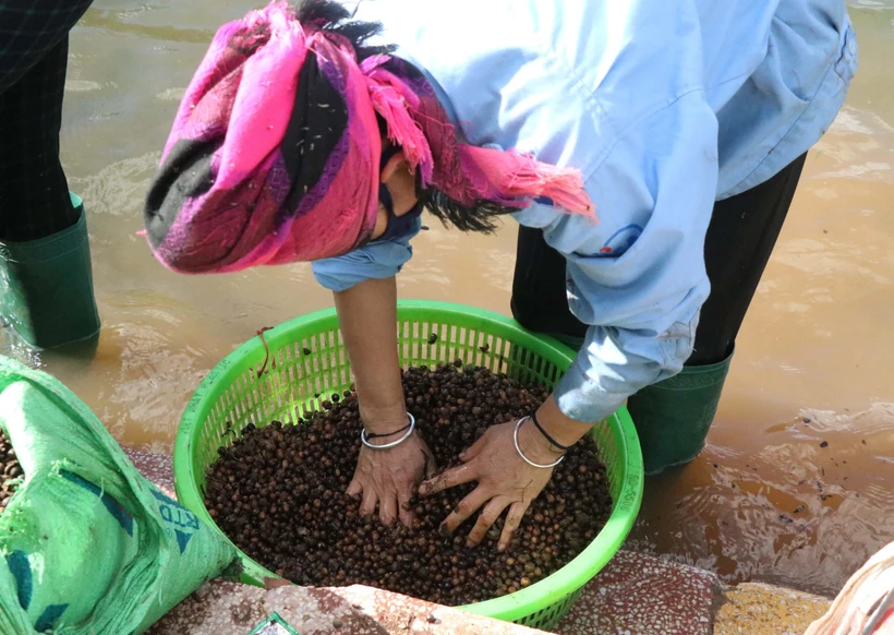 Hạt dẻ rừng được chị em phụ nữ rửa sạch, sàng lọc, phân loại tại lòng hồ Pá Khoang sau khi kết thúc quá trình thu nhặt. Ảnh: Xuân Tiến – TTXVN