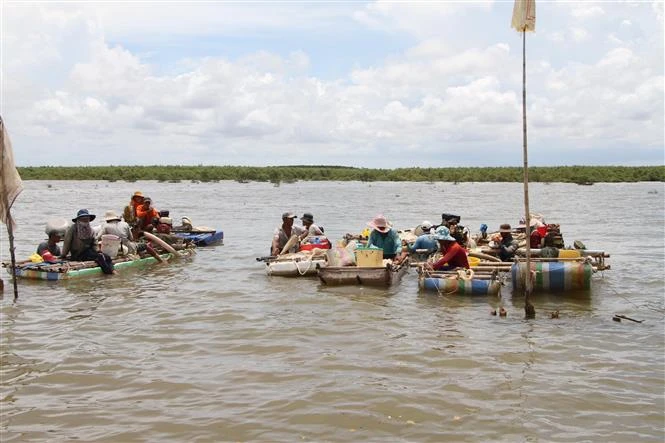 Mỗi ngày có hàng chục đến hàng trăm phương tiện từ thô sơ đến động cơ có công suất lớn khai thác nghêu, sò huyết giống. Ảnh: Chanh Đa - TTXVN