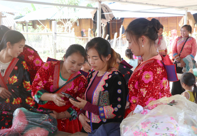 Chị em phụ nữ dân tộc Mông lưu số điện thoại của nhau khi gặp ở phiên chợ. Ảnh: Xuân Tiến – TTXVN