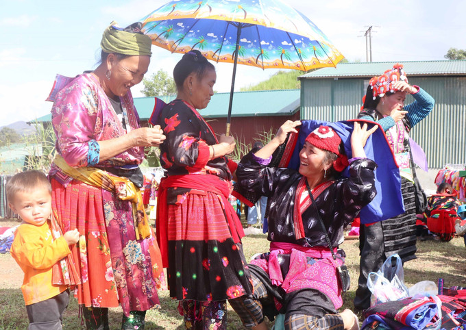 Phụ nữ dân tộc Mông thích thú khi lựa chọn, thử trang phục tại chợ phiên Phìn Hồ. Ảnh: Xuân Tiến – TTXVN