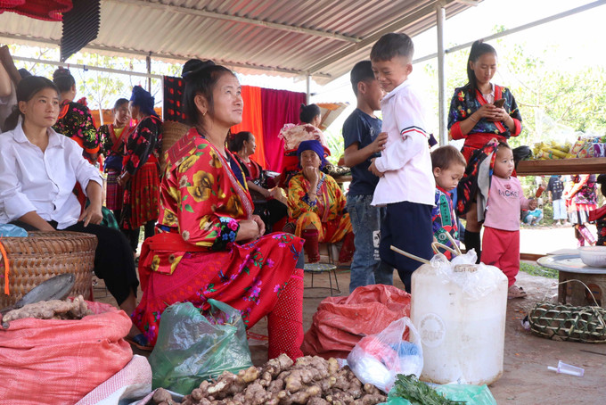Người phụ nữ dân tộc Mông bày bán những sản phẩm nông sản, rượu và các loại củ, quả. Ảnh: Xuân Tiến – TTXVN
