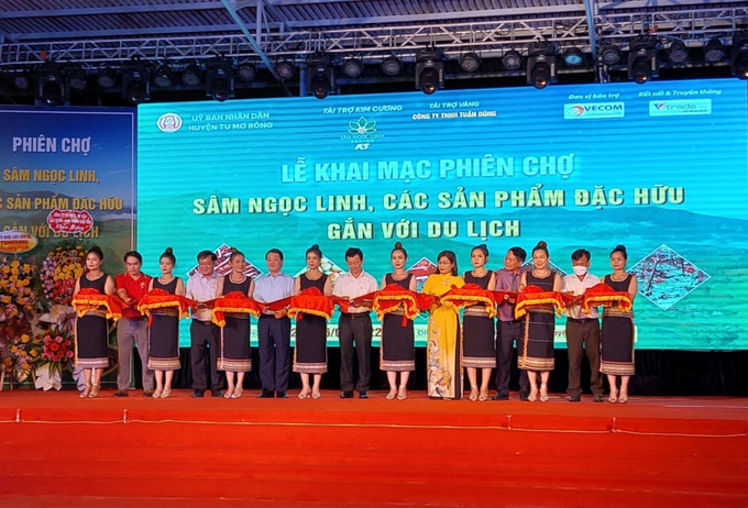 Các đại biểu cắt băng khai mạc “Phiên chợ sâm Ngọc Linh, các sản phẩm đặc hữu gắn với du lịch” ở huyện Tu Mơ Rông. Ảnh: Khoa Chương