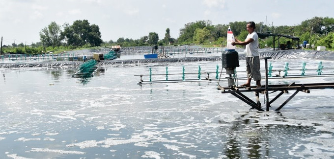 Nông dân xã Long Sơn cho tôm ăn bằng hệ thống tự động. Ảnh: baotravinh.vn