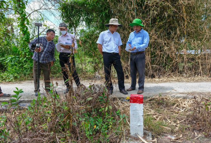 Lãnh đạo UBND huyện Thới Lai, TP. Cần Thơ kiểm tra ranh mốc giải phóng mặt bằng dự án cao tốc Châu Đốc - Cần Thơ - Sóc Trăng. Ảnh: Thanh Liêm – TTXVN