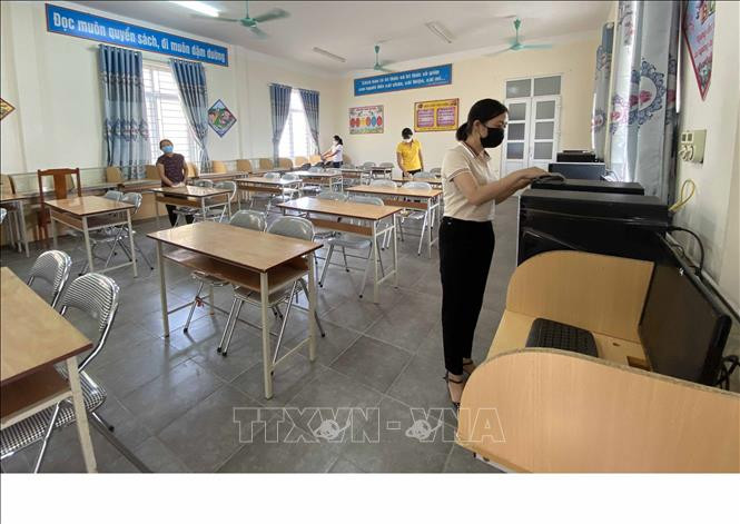 Cán bộ, giáo viên Trường THCS Nguyễn Viết Xuân, xã Ngũ Kiên, huyện Vĩnh Tường (Vĩnh Phúc) tích cực về sinh trường lớp để đón học sinh quay lại trường. Ảnh: Nguyễn Thảo – TTXVN