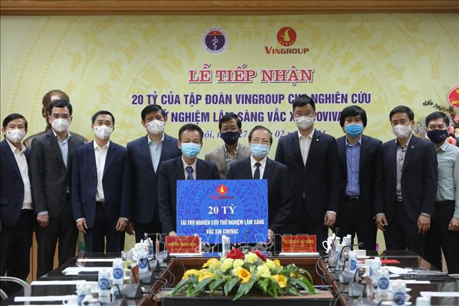 Lễ tiếp nhận 20 tỷ đồng của Tập đoàn Vingroup cho nghiên cứu thử nghiệm lâm sàng Vaccine phòng ngừa COVID-19 “Made in Vietnam” COVIVAC do Viện Vắc xin và Sinh phẩm Y tế (IVAC) trực thuộc Bộ Y tế sản xuất. Ảnh: Minh Quyết - TTXVN