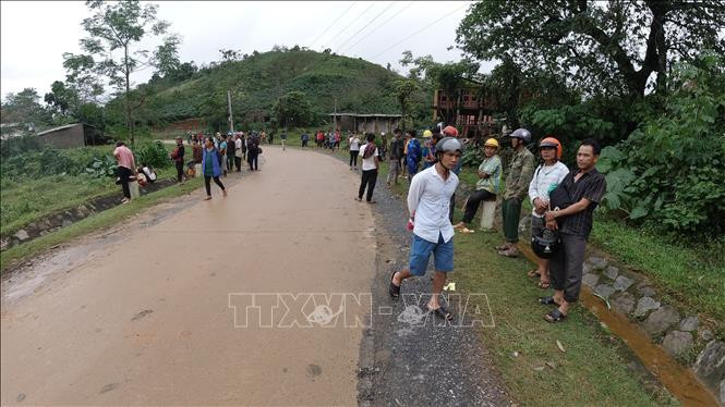 Người dân thôn Cợp ra đường theo dõi diễn biến cuộc tìm kiếm cứu nạn. Ảnh: Quốc Dũng - TTXVN