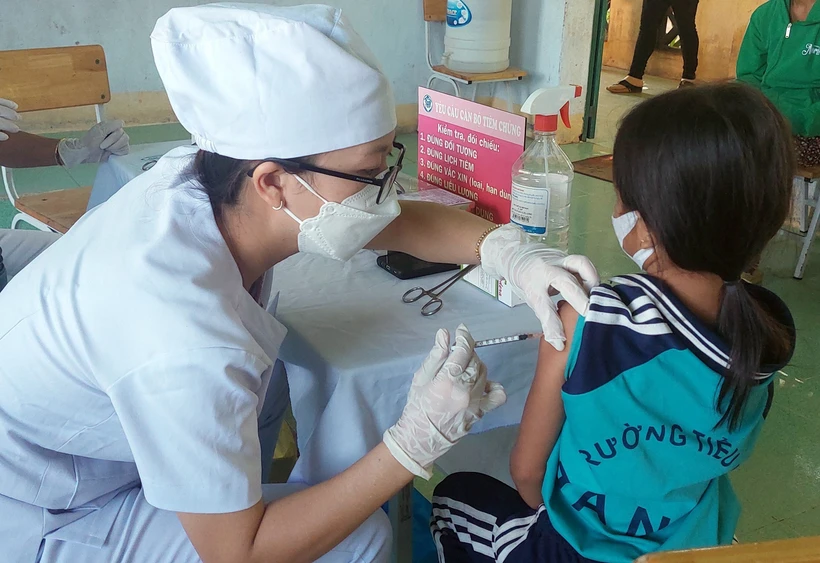 Triển khai tiêm vaccine phòng COVID-19 cho học sinh ở xã Ma Nới, huyện Ninh Sơn (Ninh Thuận). Ảnh: Công Thử - TTXVN