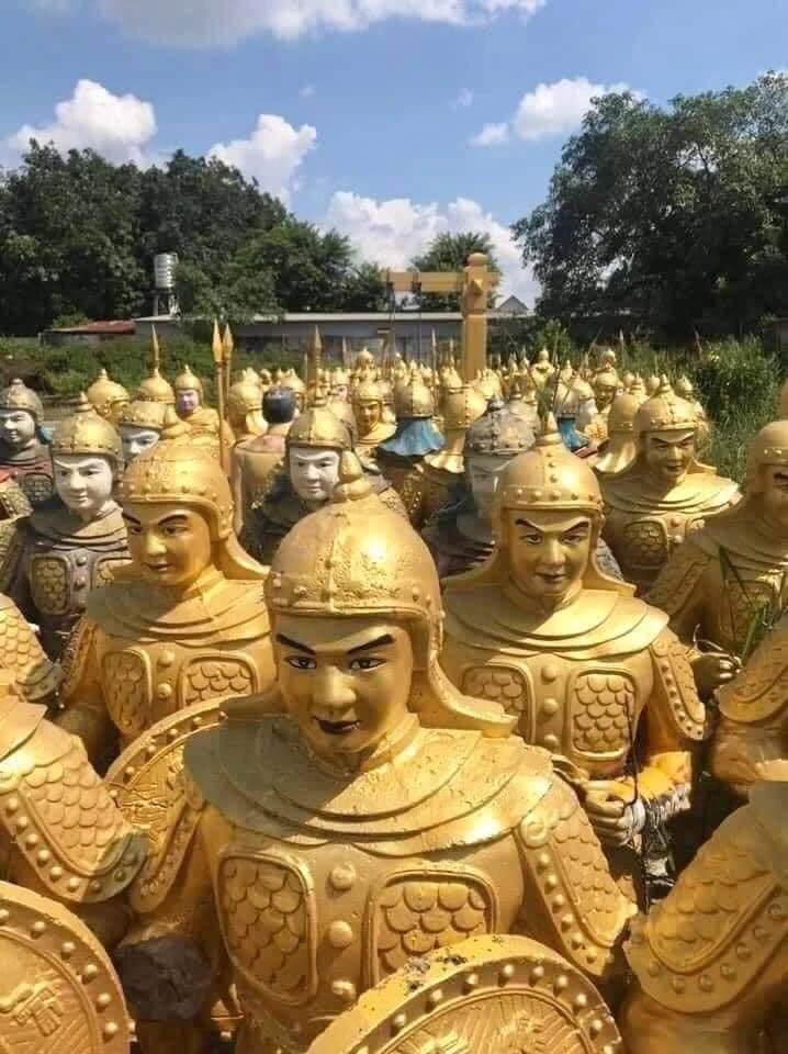 Sáng 31/8, có mặt tại bãi để xe thuộc Khu Du lịch Quỷ Núi do Liên Minh Group làm chủ đầu tư, phóng viên TTXVN chứng kiến có khoảng gần 60 bức tượng được trùm kín bạt. Đây là những bức tượng bằng bê tông cốt thép mới vận chuyển về và tập kết tại đây. Phần lớn các bức tượng trên bị hư hỏng do va đập trong quá trình vận chuyển, được để ở đây phục chế lại. Các bức tượng rất giống nhau, mô phỏng một người lính mặc áo giáp, mũ giáp trụ, mang giáo và khiên. Đáng chú ý là trên mặt khiên có biểu tượng đàn chim Lạc bay ngược chiều kim đồng hồ quanh mặt trời, giống như trên mặt Trống đồng Đông Sơn, nhưng đường nét thô hơn. Khuôn mặt của các pho tượng cũng có những đặc điểm giống người Việt hơn là người Trung Hoa.