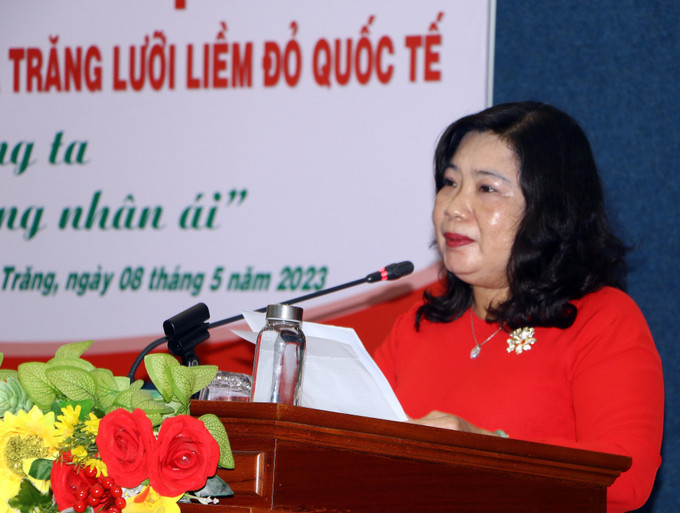 Bà Hồ Thị Cẩm Đào, Phó Bí thư Thường trực Tỉnh uỷ Sóc Trăng phát biểu tại buổi Lễ phát động Tháng nhân đạo năm 2023. Ảnh: Tuấn Phi-TTXVN