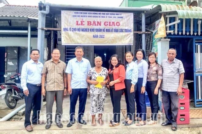Lễ bàn giao nhà cho hộ bà Châu Thị Tư, ngụ ấp Bưng Tróp A, xã An Hiệp, huyện Châu Thành (tỉnh Sóc Trăng) cuối tháng 9/2022. Ảnh: baosoctrang.org.vn