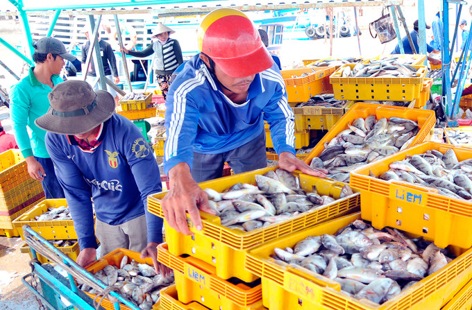 Hoạt động mua bán hải sản diễn ra sôi động tại cảng cá Trần Đề (Sóc Trăng). Ảnh: An Hiếu