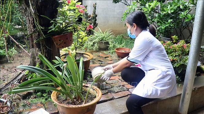 Cán bộ trạm y tế thị trấn Hát Lót lật úp vật dụng chứa nước mưa để diệt bọ gậy. Ảnh: Hữu Quyết - TTXVN