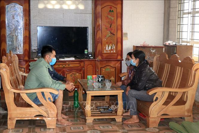 Cán bộ các cấp huyện Mường La (phải) tuyên truyền các chính sách hỗ trợ cho người lao động trở về địa phương. Ảnh: Hữu Quyết – TTXVN