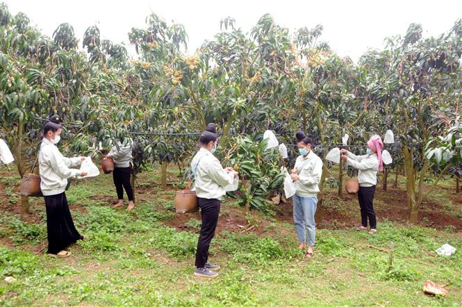 Xã viên Hợp tác xã nông nghiệp Hợp Lực Pản Phon, xã Chiềng Ngần, thành phố Sơn La bao trái cây phục vụ tiêu thụ và xuất khẩu năm 2022. Ảnh: Quang Quyết-TTXVN
