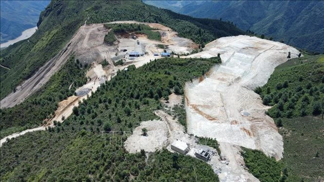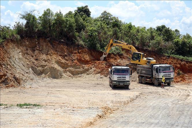 Máy móc, phương tiện được huy động để đẩy nhanh tiến độ thi công dự án bố trí, sắp xếp dân cư bản Lọng Bó, xã Chiềng Công, huyện Mường La. Ảnh: Hữu Quyết – TTXVN