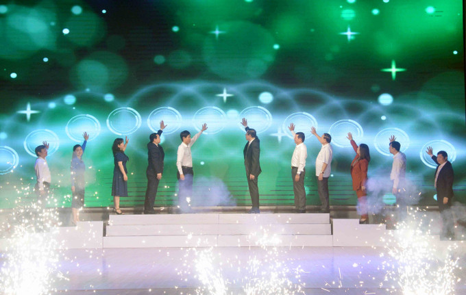 Các đại biểu thực hiện nghi thức phát động “Tuần lễ gửi tiền tiết kiệm, chung tay vì người nghèo”. Ảnh: Quang Quyết-TTXVN