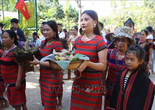 | Già làng (bên phải) cùng bố, mẹ cô dâu đưa con gái (trùm khăn đỏ) về nhà chồng trong lễ rước dâu. Ảnh: Hồ Cầu-TTXVN |