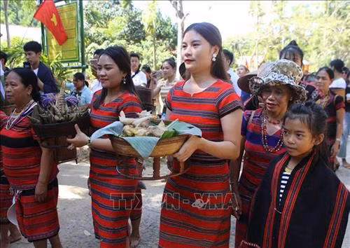 | Nhà gái mang lễ vật trong lễ đưa dâu về nhà chồng. Ảnh: Hồ Cầu-TTXVN |