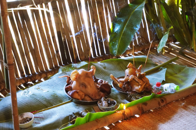 Lễ cúng thường bắt đầu vào buổi trưa, lễ vật gồm: gà, heo, rượu cần và nhiều loại bánh. Trong suốt quá trình làm lễ đều có đệm cồng chiêng để tạo bầu không khí thiêng liêng.