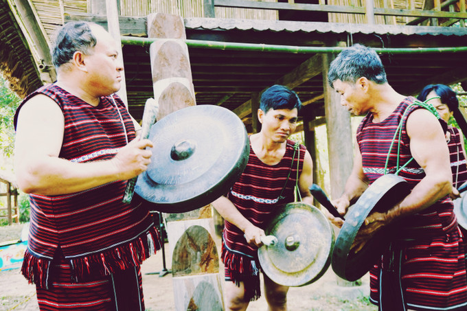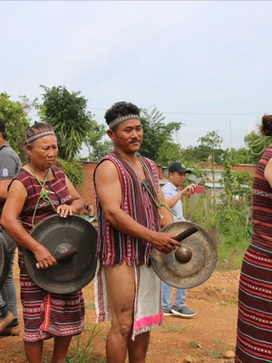 Sau phầu lễ đến phần hội, đồng bào Chơ Ro vui mừng tụ tập quanh gốc cây nêu trong âm thanh trầm bổng của cồng chiêng, nhịp khoan thả của đàn tre và tha thiết của kèn môi…