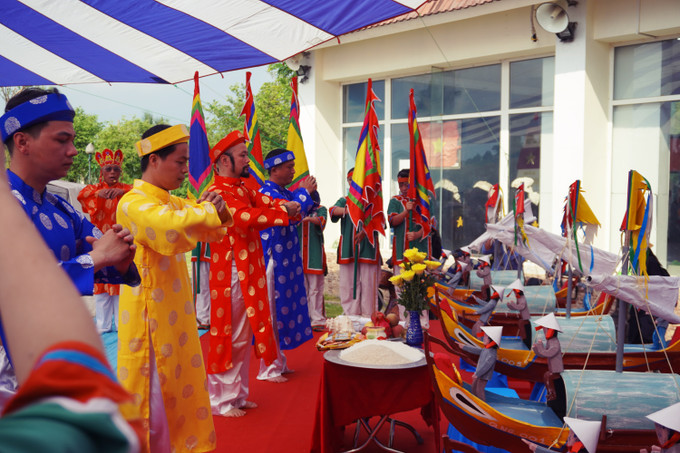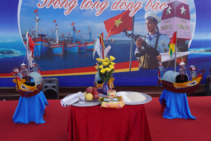 Để thực hiện nghi lễ người ta chuẩn bị 3 ban thờ đặt đồ tế như thịt heo, gà, muối, bánh khô… bài vị các Cai đội và chiến sỹ Hoàng Sa, trước các ban thờ là 5 mô hình thuyền câu (loại thuyền đội Hoàng Sa dùng đi biển).
