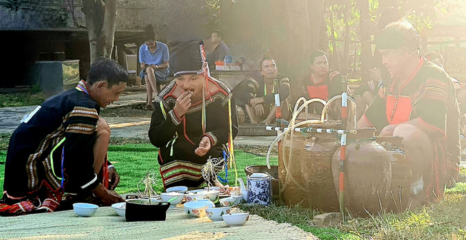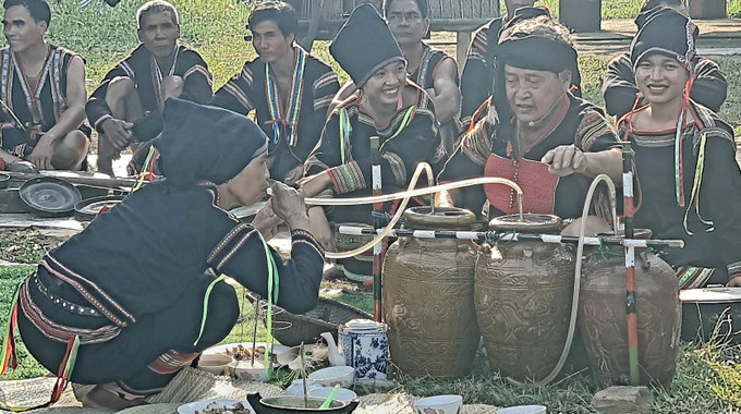 Đồng bào Gia Rai theo chế độ mẫu hệ nên những người phụ nữ sẽ uống rượu trước để lấy may. Ảnh: Hoàng Tâm