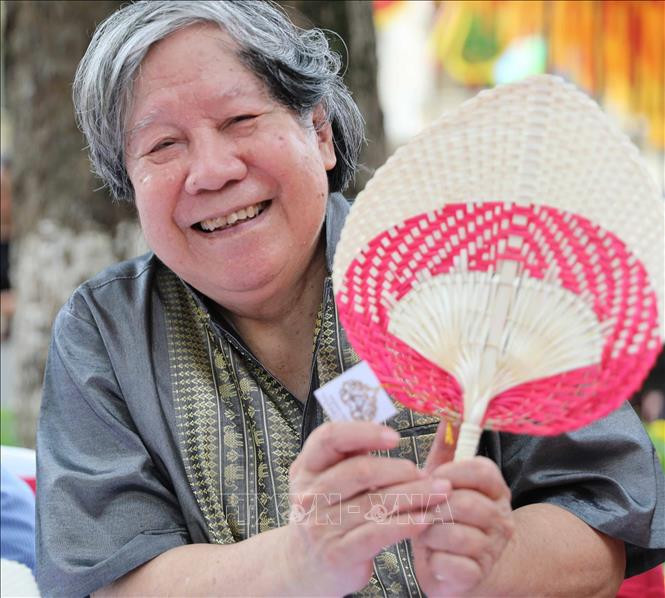Nhà sử học Lê Văn Lan phấn khởi với chiếc quạt được ban. Ảnh: Thanh Tùng - TTXVN