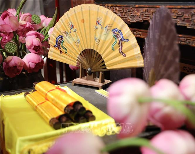 Trưng bày một số quạt dành cho vua, hoàng hậu và quan được phỏng dựng trên các nguồn tư liệu. Ảnh: Thanh Tùng - TTXVN