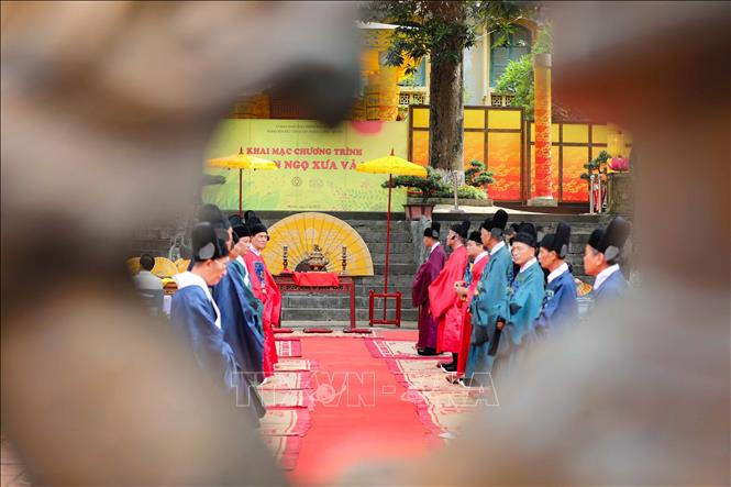 Tái hiện nghi lễ ban quạt dịp Tết Đoan Ngọ. Ảnh: Thanh Tùng - TTXVN
