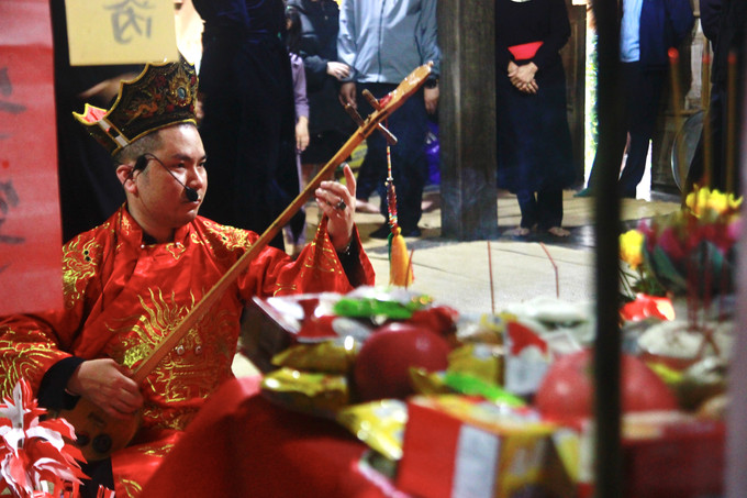 Thầy Then xin tổ sư được mặc áo, mũ thầy để hành lễ. Ảnh: Phương Loan