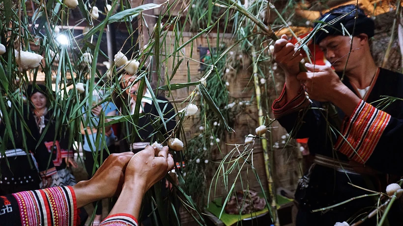 Mọi người gắn bánh lên cây tre tượng trưng cho mùa màng bội thu. Ảnh: Hoàng Tâm