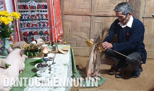 | Thầy cúng thực hiện nghi lễ cúng giao thừa của đồng bào Dao. Ảnh: Nam Sương |