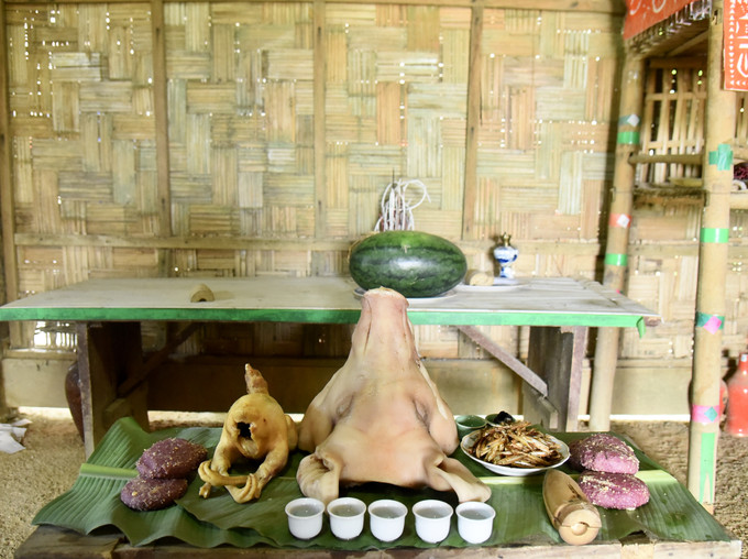Sau đó, tất cả được đặt vào một mâm lễ trên bàn gỗ dâng lên trước bàn thờ tổ tiên. Theo quan niệm của đồng bào, mâm cúng phải đầy đủ rượu thịt để tỏ lòng biết ơn đối với tổ tiên, phải có tiền bạc để tổ tiên làm lộ phí.