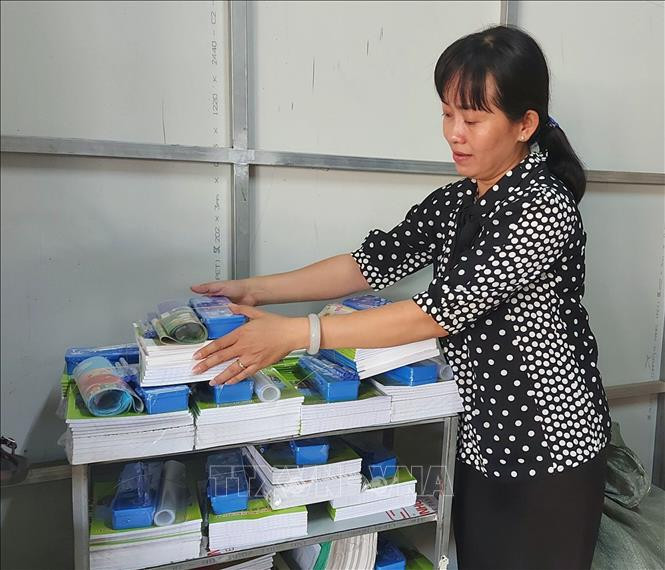 Cô Lê Thị Anh Đào sắp xếp tập vở, đồ dùng học tập ngăn nắp để cho các em học sinh đến nhận. Ảnh: Lê Sen - TTXVN