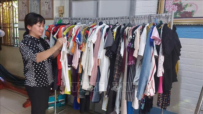 Cô Lê Thị Anh Đào sắp xếp quần áo ngăn nắp để cho các em học sinh đến nhận. Ảnh: Lê Sen - TTXVN