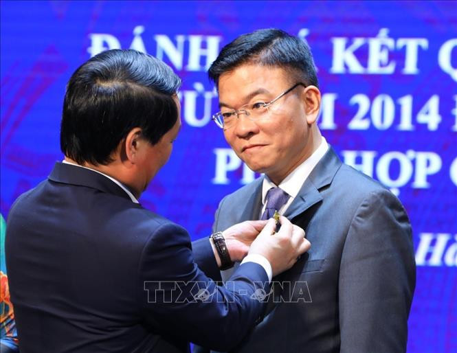 Bộ trưởng Bộ Tư pháp Lê Thành Long trao Kỷ niệm chương "Vì sự nghiệp Tư pháp" cho các cá nhân. Ảnh: Văn Điệp – TTXVN