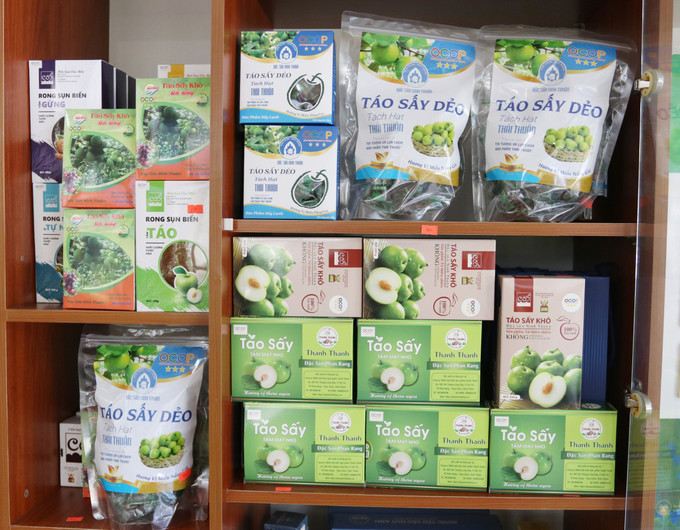 Các sản phẩm chế biến từ quả táo được bày bán tại điểm giới thiệu sản phẩm đặc thù của Hội Doanh nhân trẻ tỉnh Ninh Thuận (thành phố Phan Rang - Tháp Chàm). Ảnh: Nguyễn Thành - TTXVN