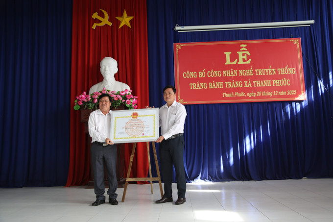 Trao công nhận nghề bánh tráng thủ công ở ấp Cây Xoài là nghề truyền thống. Ảnh: Thanh Tân - TTXVN
